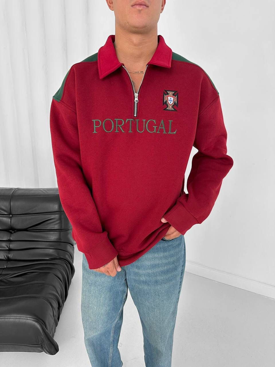 Portekiz Nakış Logo Oversize Yarım Fermuar Polo Yaka Sweatshirt